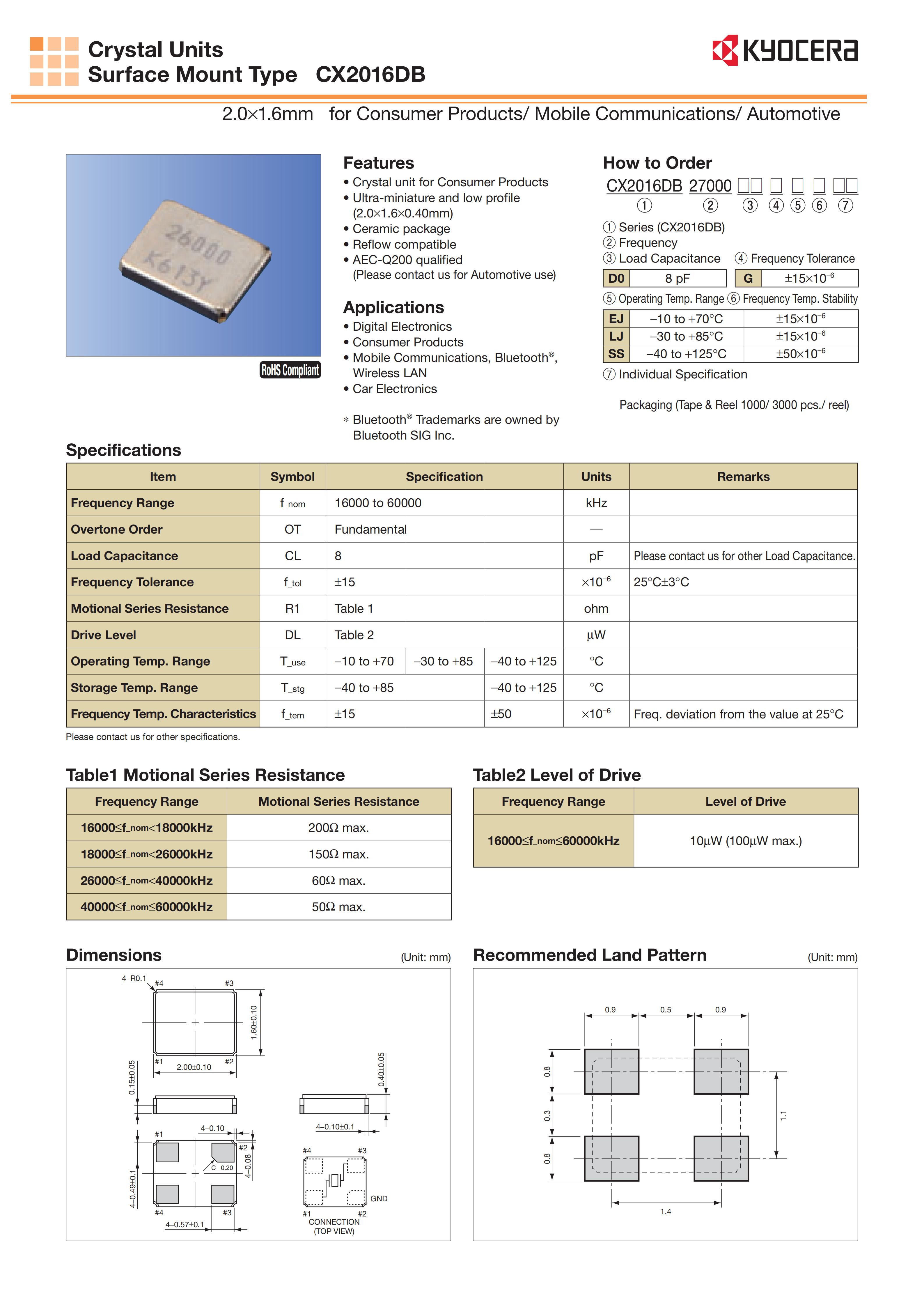 CX2016DB27000D0GEJZ1CX2016DB27MHz15PPM8PF-10°C ~ 70°C加科電子