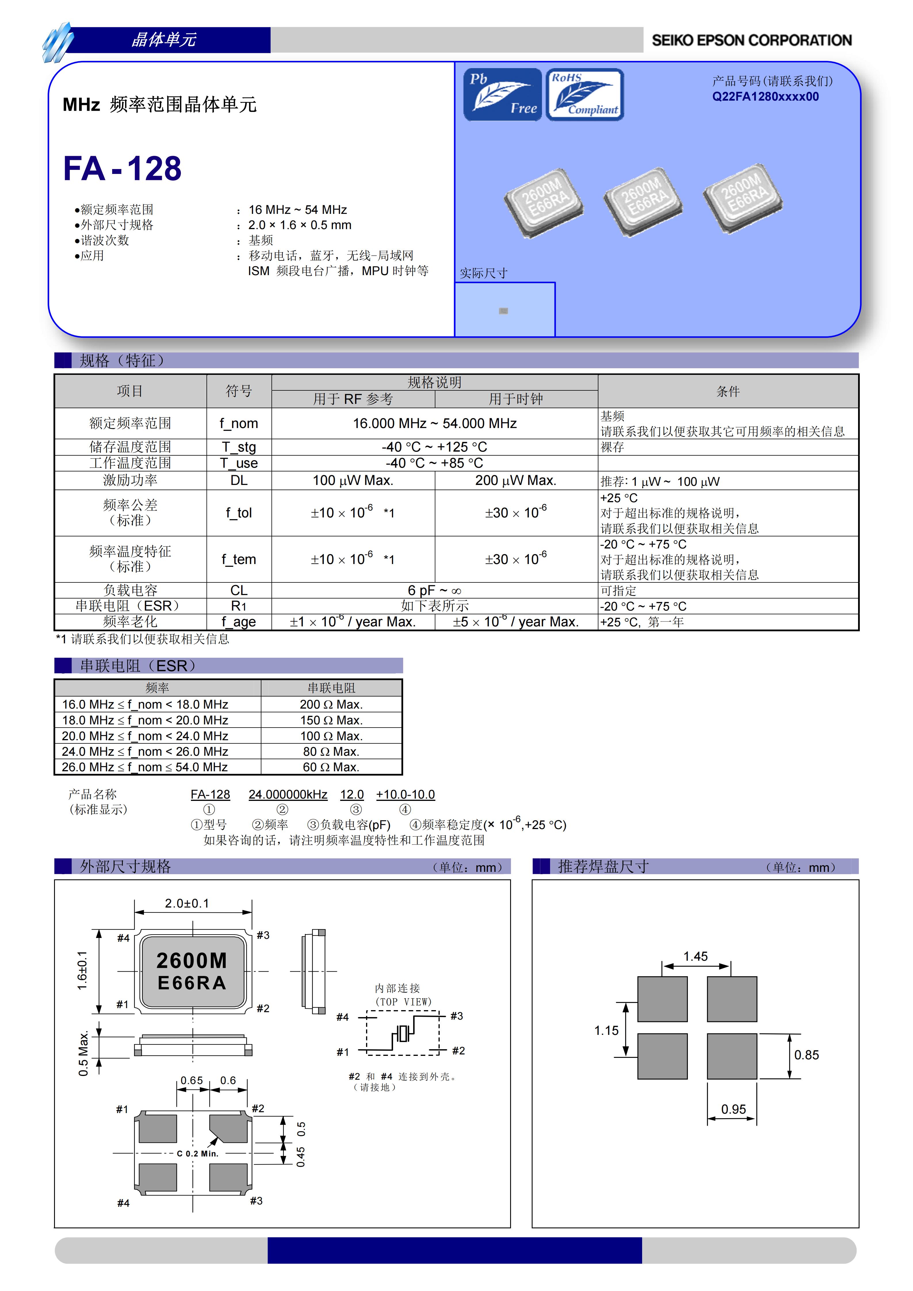 | Q22FA1280041600 | FA-128 | 16MHz | 22PF | 30PPM | 加科電子 | |
